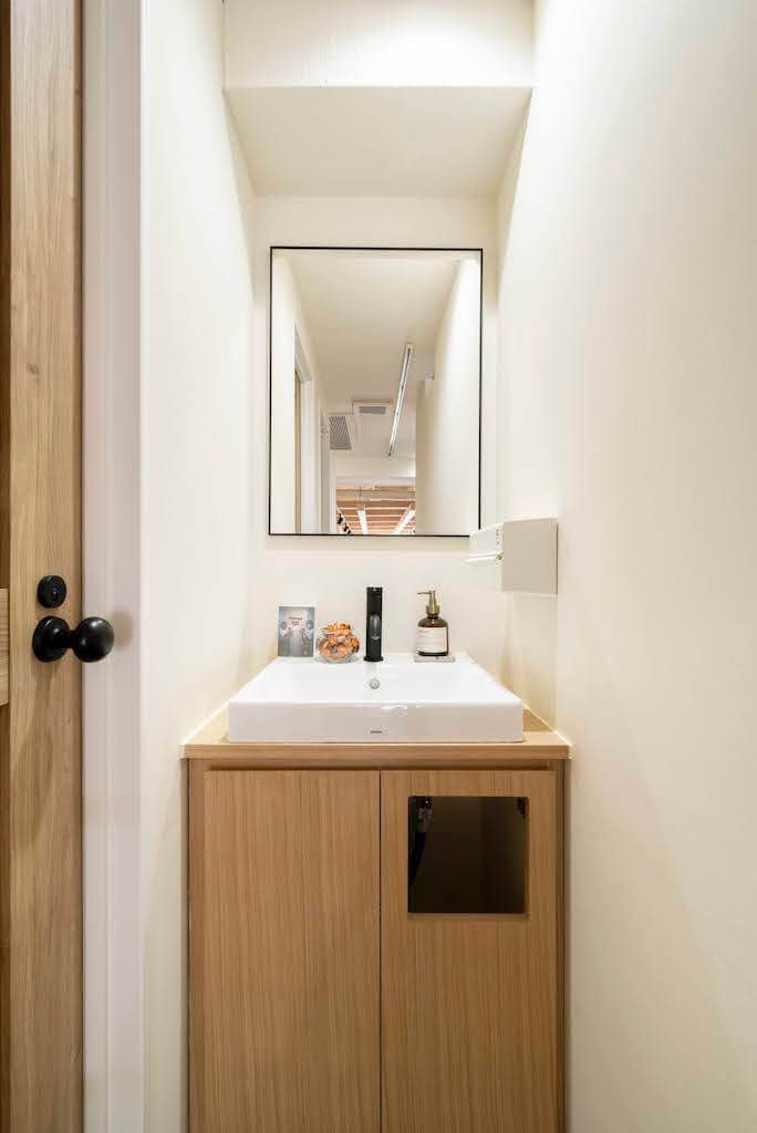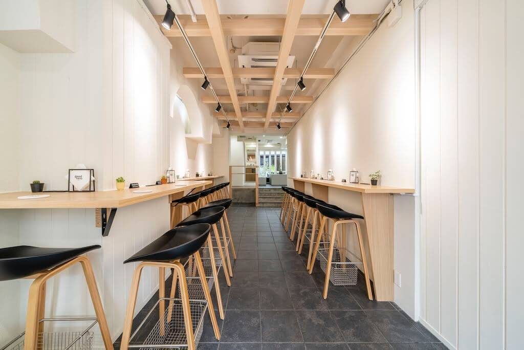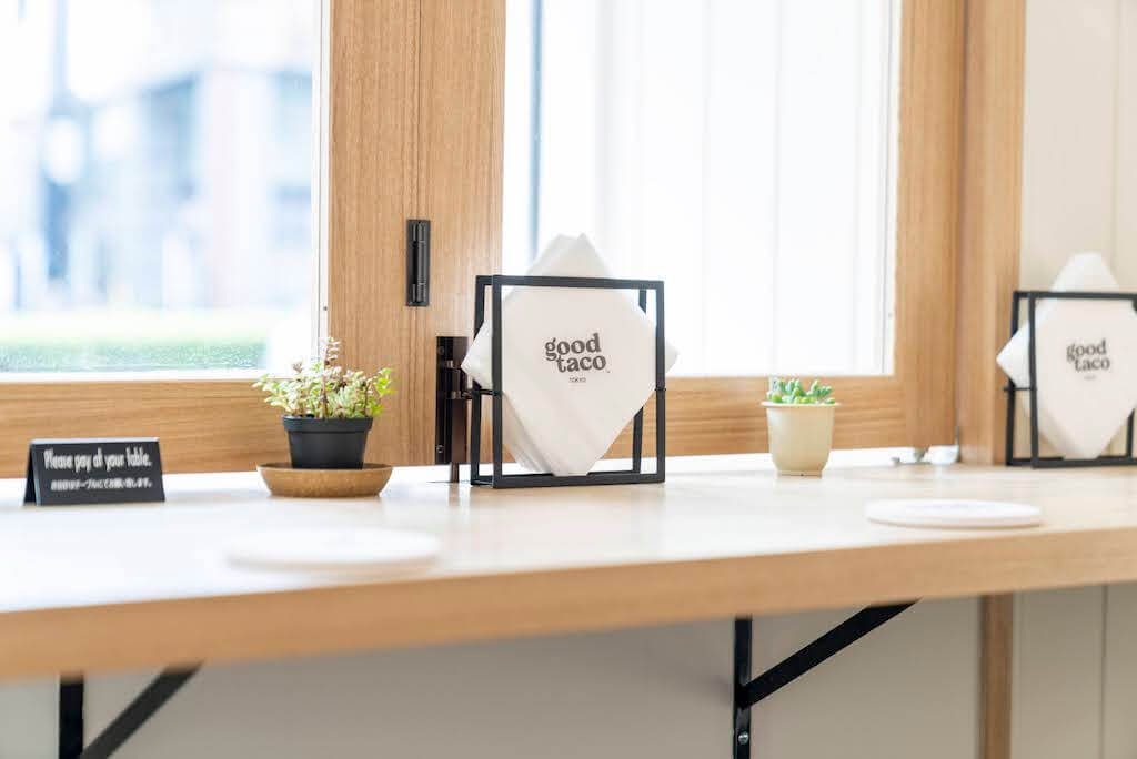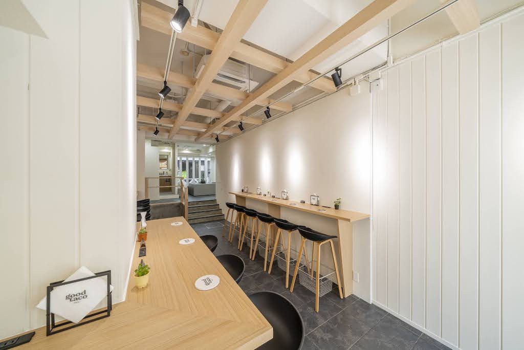 「タコス屋さんと聞いたらメキシカンな雰囲気でメキシコ料理がある店をイメージすると思うが、スタイリッシュな空間で他の店では味わえない、グッタコならではの体験をお客さまに届けたい。」というオーナー様からのリクエストで、木、白、グリーンを使ったナチュラルでスタイリッシュな印象に。