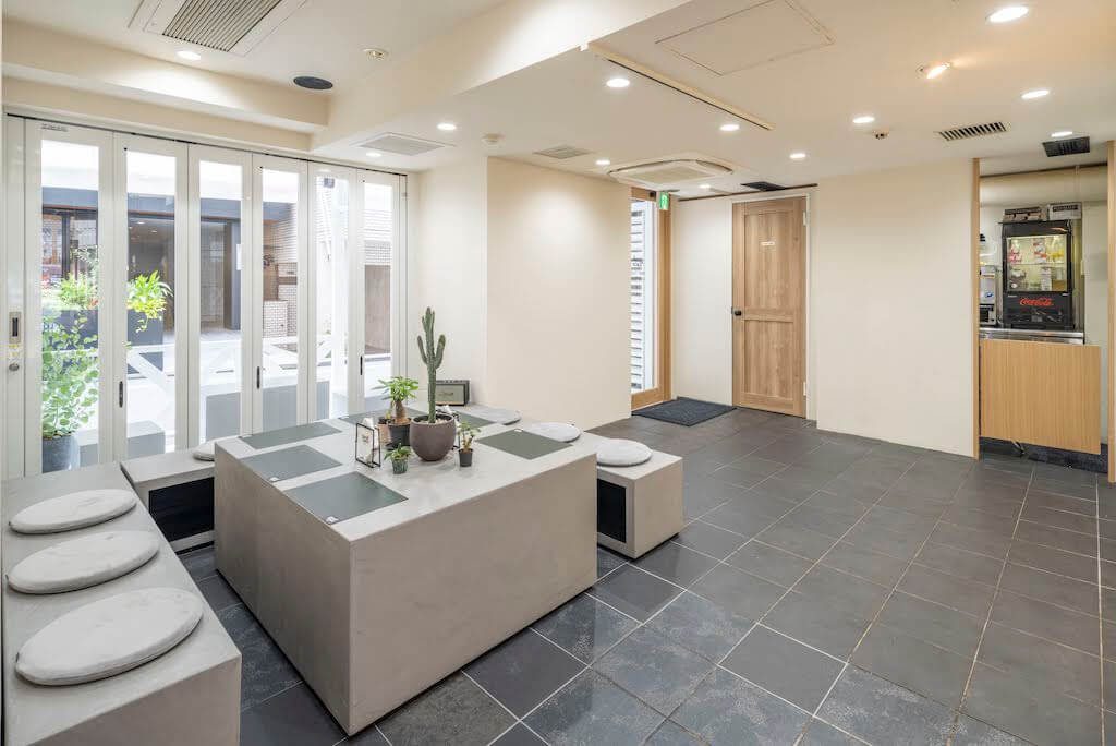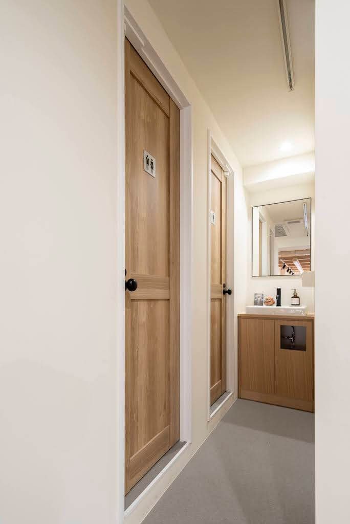 また、両側にある出入口には、道路に面したカウンターや、テラス席をつくることで、召し上がっているお客様の表情が外にも伝わるようなレイアウトにいたしました。